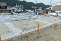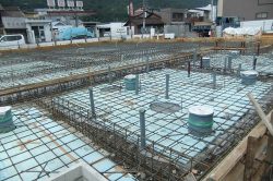 着工から1カ月半 ぎらぎら照りつける太陽のもと、 焼き付いた鉄筋の組み立ては灼熱地獄です 水分補給しながらの作業は遅れ気味ですが、 体が資本の我々,安全が第一です。 あせらず、 8月29日の建て方に向け進行中です
